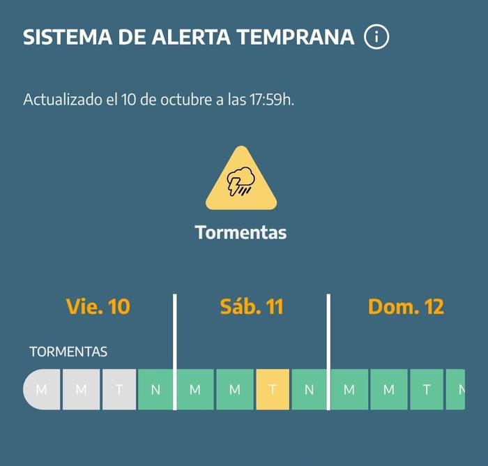 El Servicio Meteorológico Nacional emitió una alerta amarilla por tormentas fuertes para el día sábado por la tarde en nuestra ciudad.