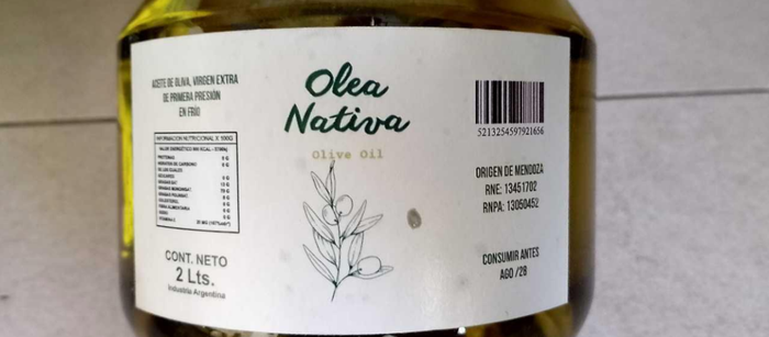 Aceite de oliva virgen extra de primera presión en frío marca “Olea Nativa – olive oil”, Origen de Mendoza, RNE 13451702 – RNPA 13050452.