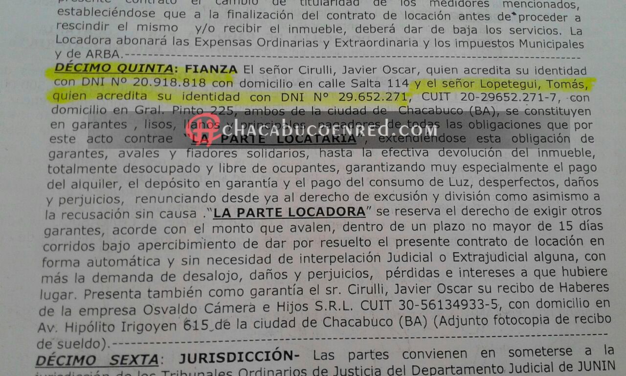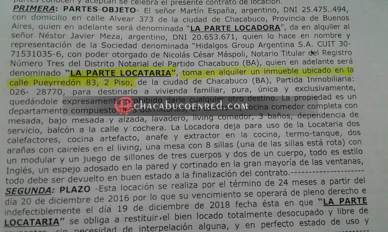 Se trata de un contrato de alquiler de un departamento en la calle Pueyrredón 83, piso 2, que se le alquila a Hidalgo´s Group Argentina S.A, representado por su presidente, Nestor Meza. Lo curioso es que una de las personas que se designan como garantes del contrato es Tomás Lopetegui, contador que comparte oficina con Agustín Máspoli y desde cuyo estudio se envió el mail con la nota firmada por Meza que mostró la Cooperativa Eléctrica. Nota que luego fue desmentida por el propio Meza, denunciando que le falsificaron la firma.