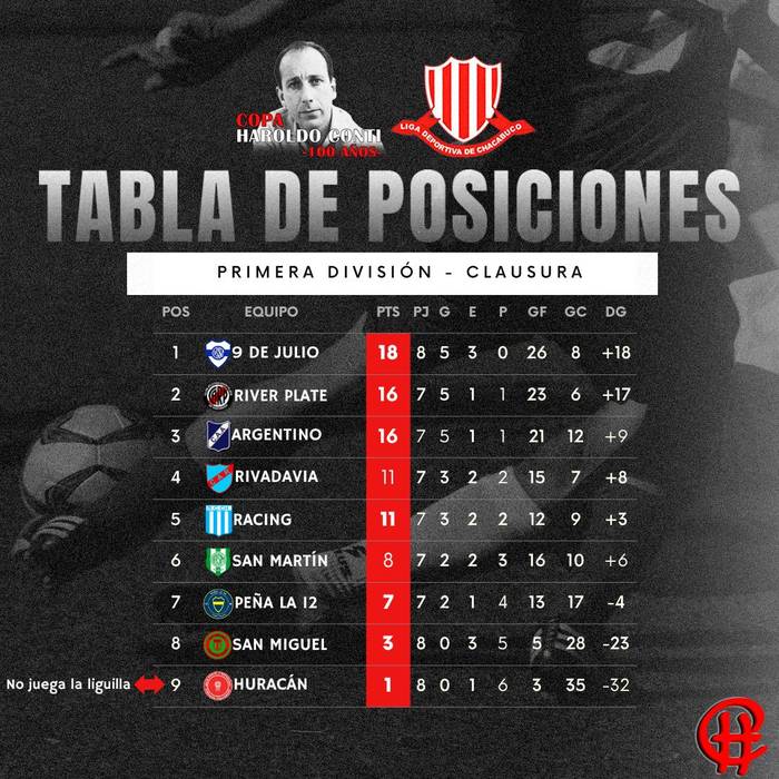 Este miércoles por la noche, 9 de Julio venció a Huracán por 8 a 0 en el encuentro que abrió la última fecha de la fase regular de la Etapa Clausura del Campeonato Local de Primera división, que organiza la Liga Deportiva de Chacabuco. Ante este resultado, el Globo quedó en el fondo de la tabla y sin posibilidades de acceder a la liguilla.