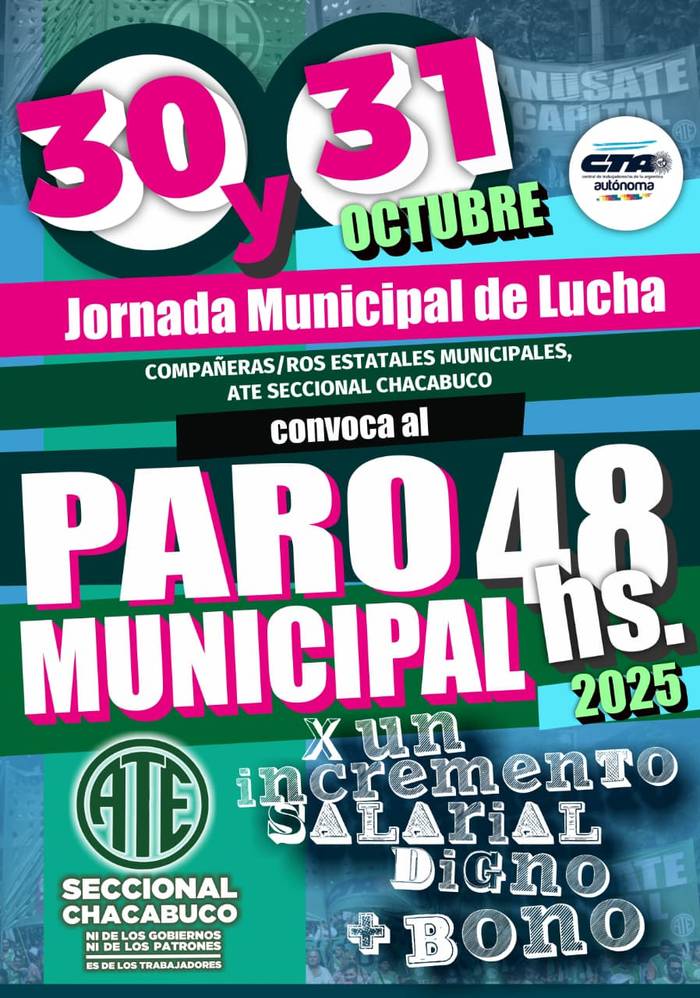 La Asociación Trabajadores del Estado (ATE) Seccional Chacabuco anunció una jornada municipal de lucha que se llevará a cabo los días jueves 30 y viernes 31 de octubre, en el marco de un paro general de 48 horas que alcanza a trabajadores y trabajadoras del ámbito municipal.