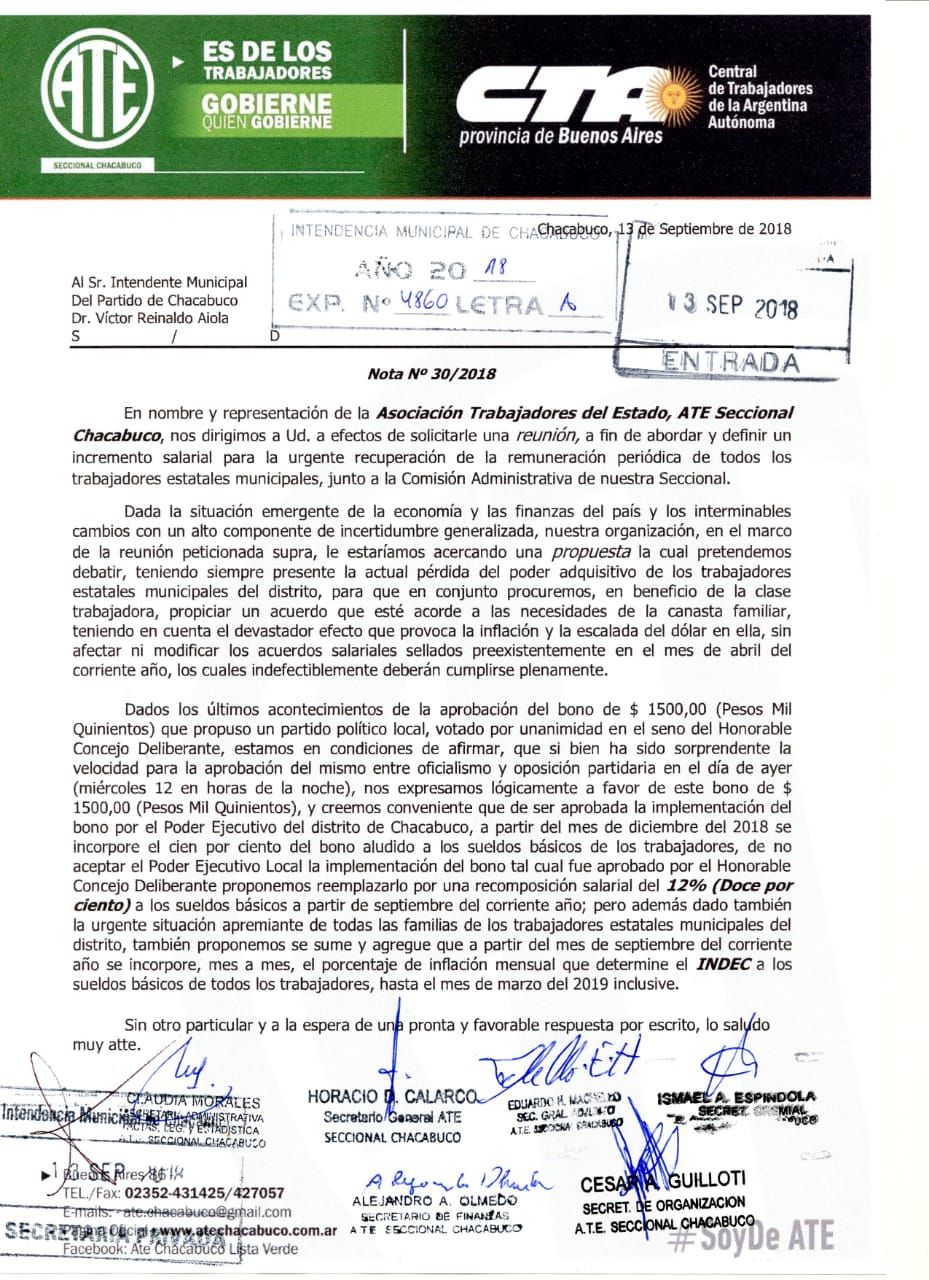 En la nota, los trabajadores aducen una notable caída del poder adquisitivo producto de los sucesivos aumentos de precios que se vienen dando.