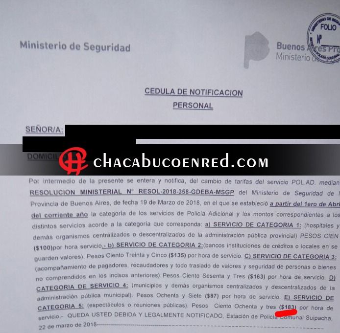 Chacabuco en Red tuvo acceso al acta enviada por el Ministerio de Seguridad de la Provincia de Buenos Aires, en donde aclara que en espectáculos deportivos el costo por por personal policial ascendería a $183 por hora, valores que están cerca de duplicar los costos actuales.