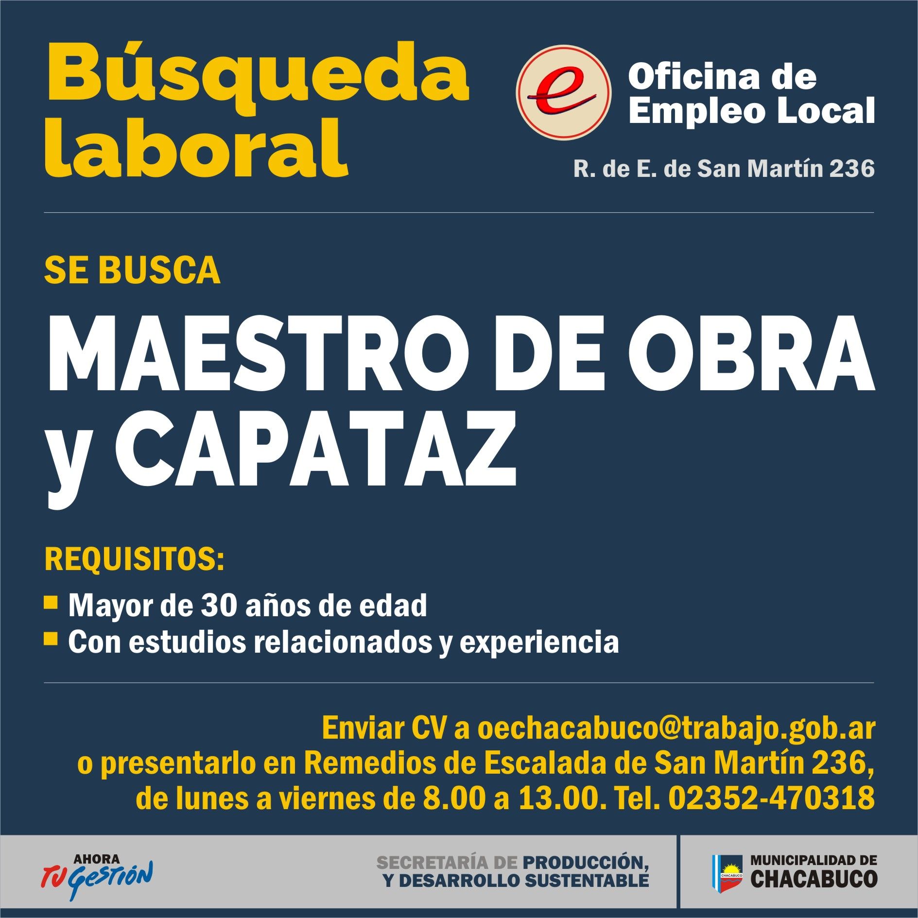 Se solicita enviar CV a [email protected] o presentarlo en Remedios de Escalda de San Martín 236, de lunes a viernes, de 8:00 a 13:00.