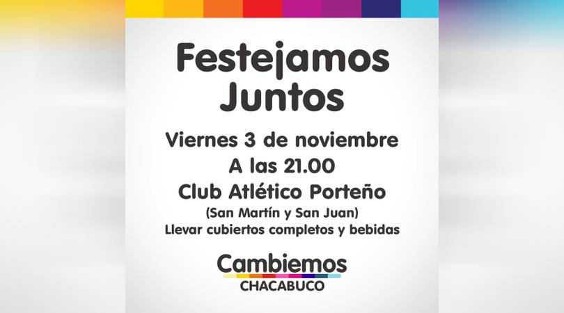 Este viernes 3 de noviembre, a las 21.00, en el Club Atlético Porteño (calles San Martín y San Juan) de la ciudad de Chacabuco (Buenos Aires), se llevará a cabo el acto oficial de los festejos de Cambiemos Chacabuco.