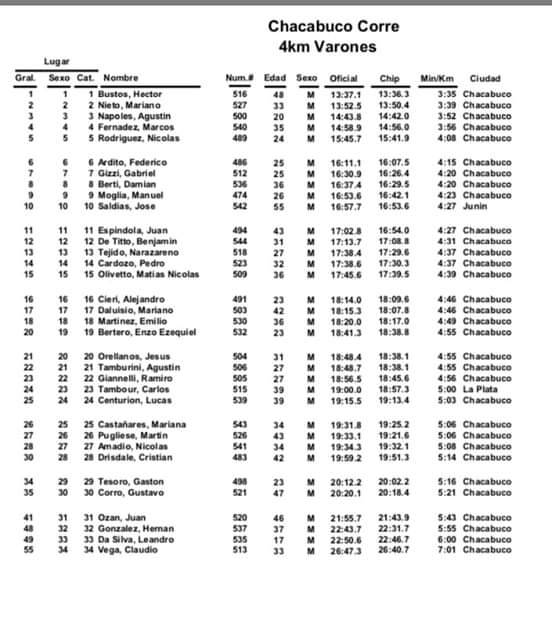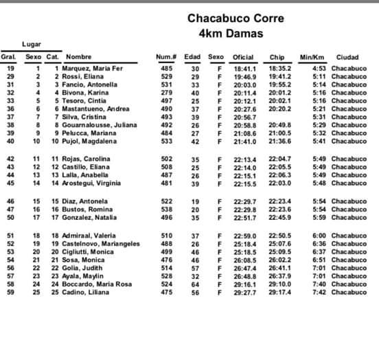 La clasificación general quedó en manos de Mauro Rozza con un tiempp de 23 minutos y 48 segundos. En damas, la mejor en los 8 kilometros fue Guillermina Reynoso con un tiempo de 32 minutos y 30 segundos.