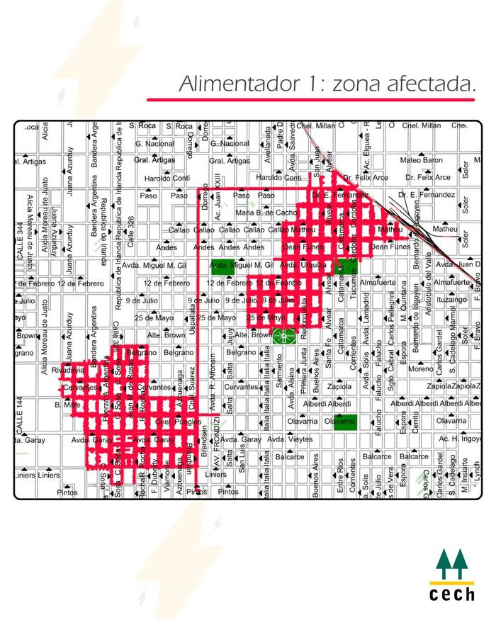 En estos momentos, Personal de Guardia de la Cooperativa Eléctrica se encuentra trabajando para restablecer el servicio tras un inconveniente en el Alimentador 1. Se trata de un corte preventivo.