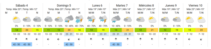 - Jueves 9: Mayormente nublado, con un ligero descenso de la temperatura (máxima de 19°C).
