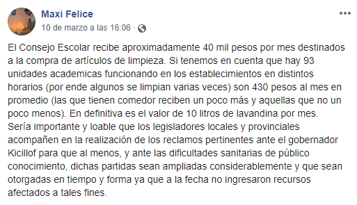 El pasado martes, en su Facebook personal, el secretario de Evaluación de Gestión, Maximiliano Felice, criticó la gestión del Gobernador Axel Kicillof por los fondos que envía a las escuelas de Chacabuco para adquirir productos de limpieza.