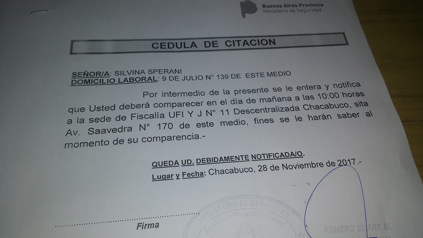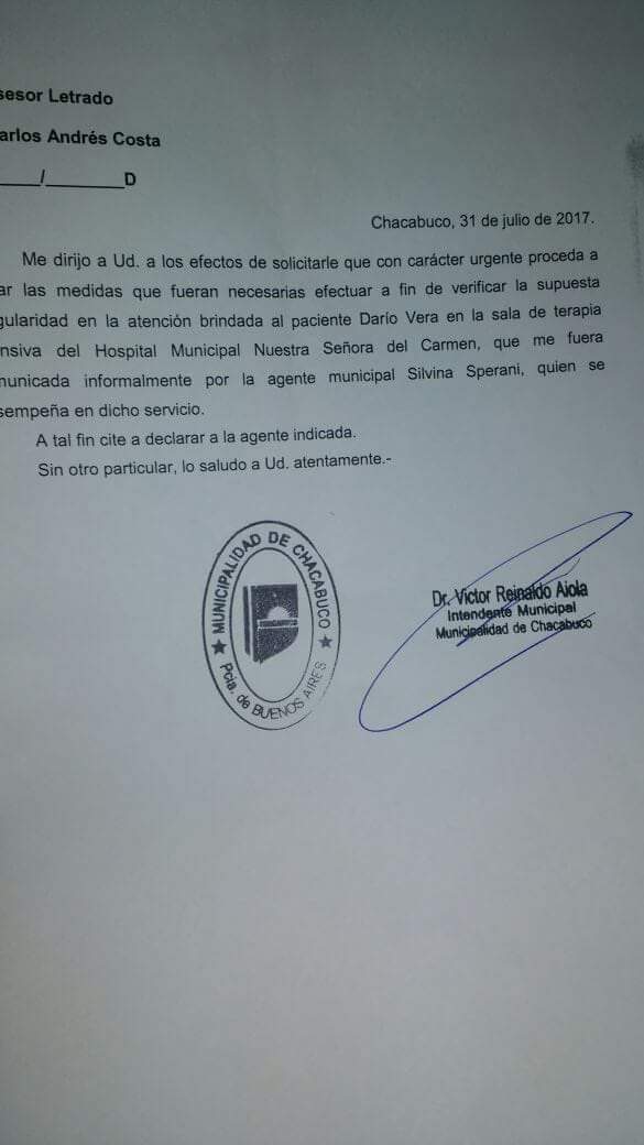 Entre las publicaciones que realizó se encuentra una nota del Intendente Víctor Aiola, dirigida al asesor letrado, Carlos Costa en la que le pide “tomar las medidas necesarias a fin de verificar la supuesta irregularidad en la atención brindada al paciente Darío Vera en la sala de Terapia Intensiva del Hospital del Carmen, que me fuera comunicada informalmente por la agente municipal Silvina Sperani”. Sobre el final de la nota, que tiene fecha del 31 de julio, Aiola le pide a Costa que la cite a declarar. A raíz de las publicaciones de la empleada, en el día de hoy le llegó una citación de la Fiscalía UFI y J Nº 11 descentralizada de Chacabuco para que preste declaración. En su muro de Facebook, Sperani asegura tener como pruebas distintos audios grabados de conversaciones con funcionarios municipales.Nota de Aiola a Costa