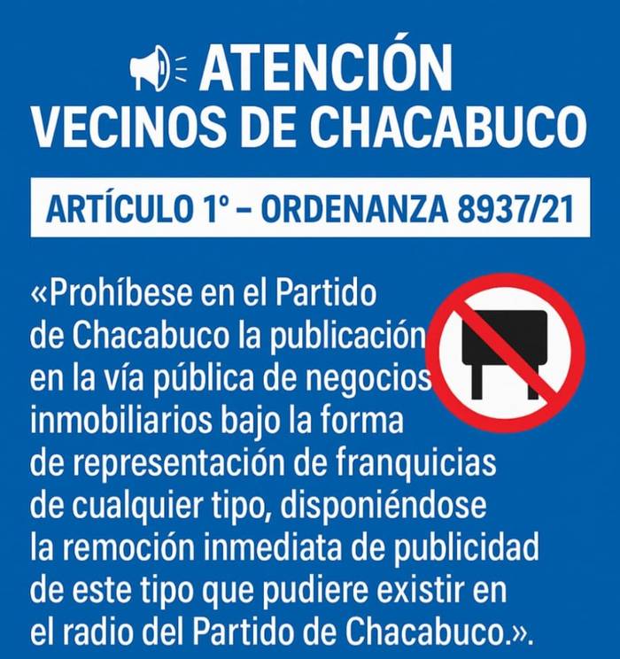 En Chacabuco se encuentra vigente desde 2021 la ordenanza 8937, que prohíbe en todo el partido la publicación en la vía pública de franquicias inmobiliarias. Por ello, el juez Felice dispuso la remoción del cartel de venta.