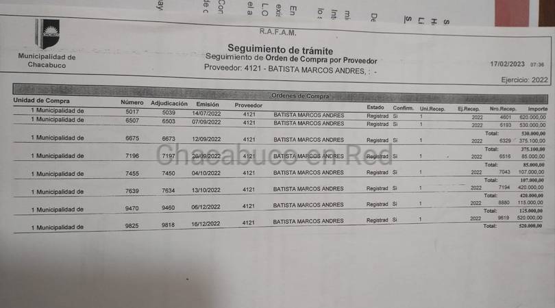 Los concejales, recibieron los documentos y los analizarán en las próximas horas. Sin embargo, un participante de la reunión contó a Chacabuco en Red que, a primera vista, hay algunos datos que llaman la atención. Por ejemplo, que los números de factura del proveedor son consecutivos, es decir que la Municipalidad era la única empresa a la que le facturaba.
