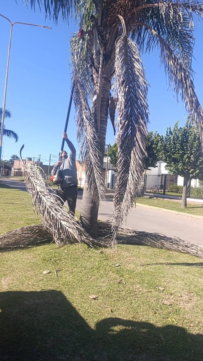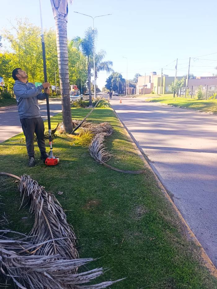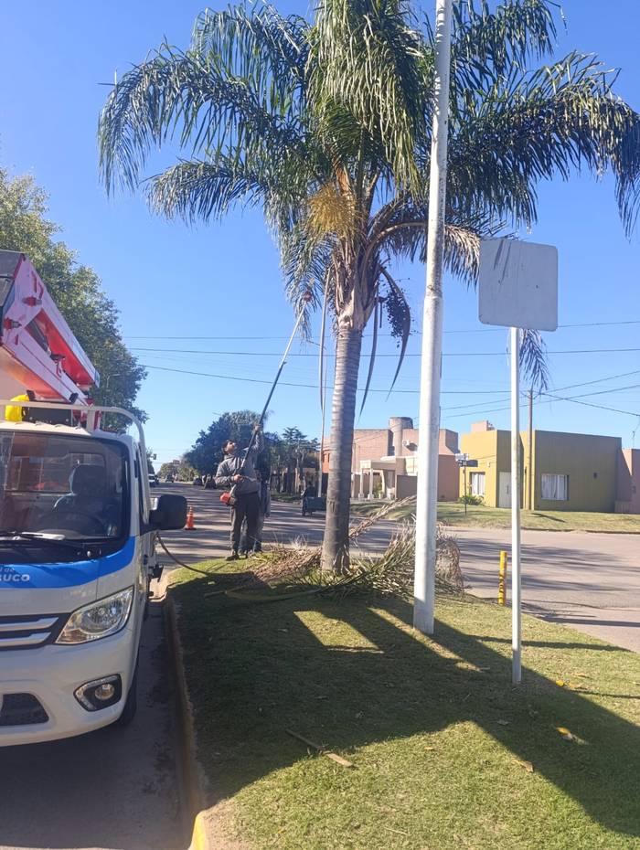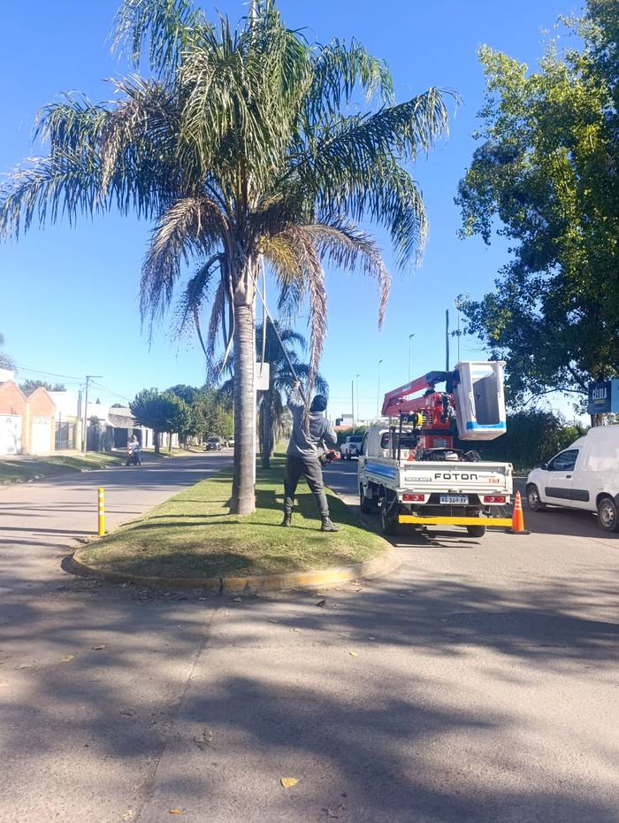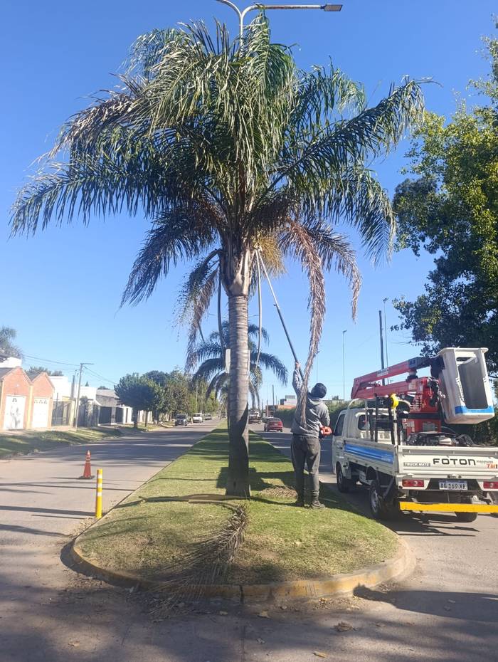 Personal de Arbolado Público, dependiente del área que encabeza Rogelio Crespo, junto a trabajadores de Producción Agraria a cargo de Pablo Meisozo, se encuentran realizando tareas de mantenimiento sobre las palmeras ubicadas en la avenida Juan XXIII.