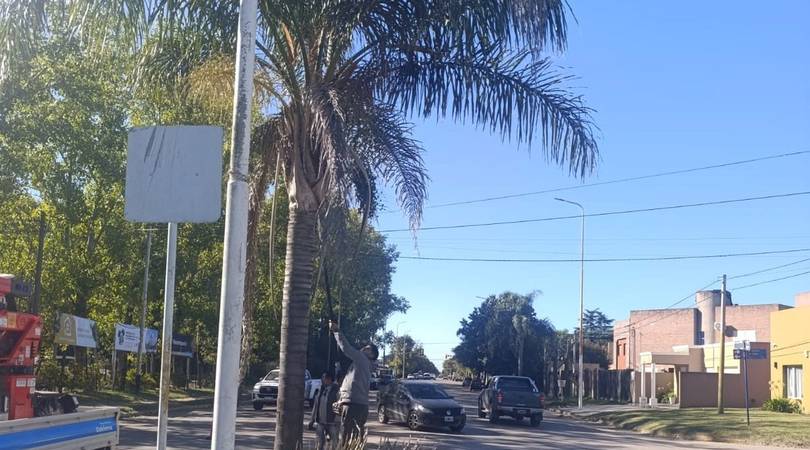 Personal de Arbolado Público, dependiente del área que encabeza Rogelio Crespo, junto a trabajadores de Producción Agraria a cargo de Pablo Meisozo, se encuentran realizando tareas de mantenimiento sobre las palmeras ubicadas en la avenida Juan XXIII.