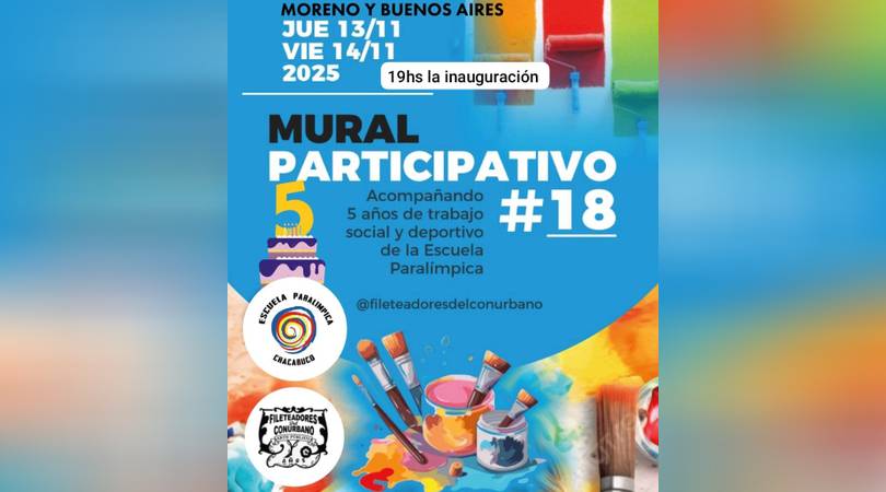 En ese marco, los días 13 y 14 de noviembre se realizará en Chacabuco el mural participativo número 18, en conjunto con la Escuela Paralímpica. La convocatoria está abierta a todas y todos los vecinos, artistas y público en general, para compartir dos jornadas de pintura y encuentro.