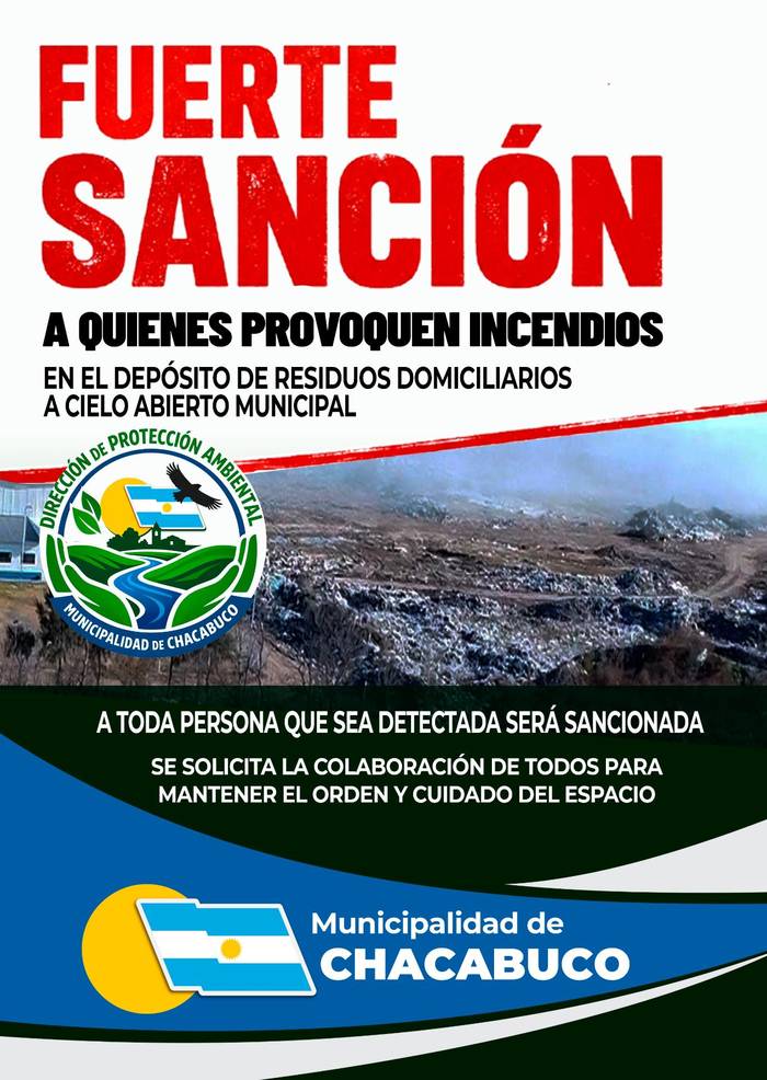 La Directora de Protección Ambiental, a cargo de Florencia Adducci Recofsky, comunica a la población que queda prohibido encender fuego en el depósito de residuos domiciliarios a cielo abierto municipal y que toda persona que sea detectada provocando incendios en el lugar será sancionada con la multa correspondiente.