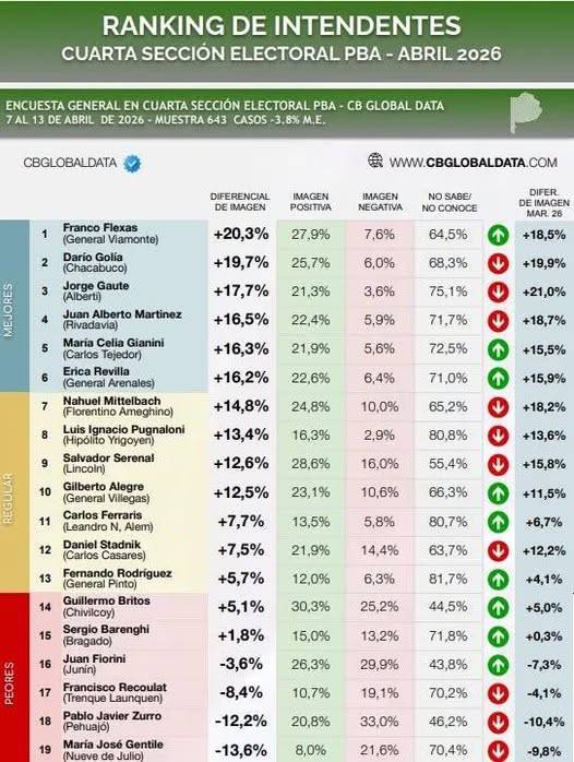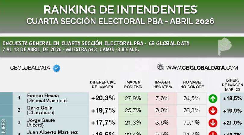 En abril, detrás de Flexas y Golía se encuentran Jorge Gaute, de Alberti (con un diferencial positivo de 17,7%), Juan Alberto Martínez, de Rivadavia (+16,5%); Maria Celia Gianini, de Carlos Tejedor (+16,3%); Érica Revilla, de General Arenales (+16,2%), y Nahuel Mittelbach, de Ameghino (+14,8%).