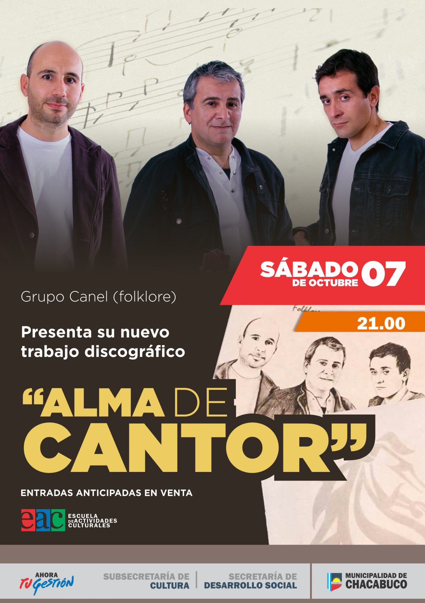 El próximo sábado 7 de octubre a las 21:00 en la Sala de la EAC (Avellaneda 127) el Grupo Canel presentará su nuevo material discográfico “Alma de Cantor”.