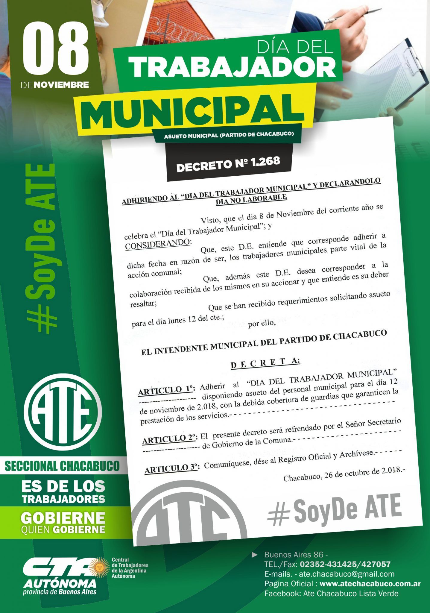 Si bien el Día del Trabajador Municipal fue el pasado 8 de noviembre, el Intendente Municipal Víctor Aiola, decretó asueto este lunes 12 para todo el personal municipal en su día.