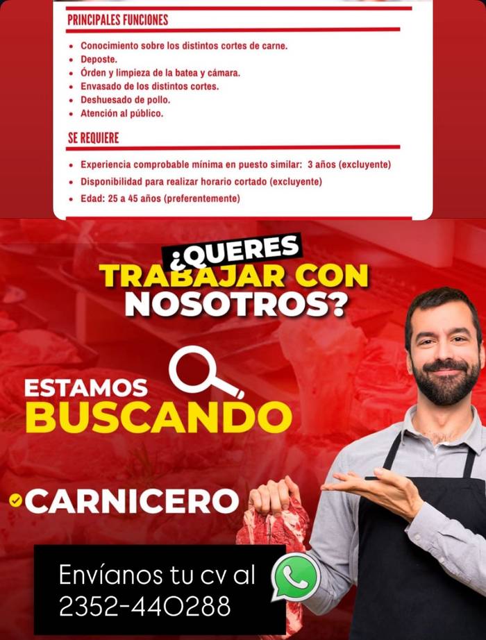 Una reconocido comercio de la ciudad se encuentra en la búsqueda de personal para incorporar a su equipo de trabajo. La convocatoria está dirigida a carniceros con experiencia comprobable, que cumplan con los siguientes requisitos y funciones.