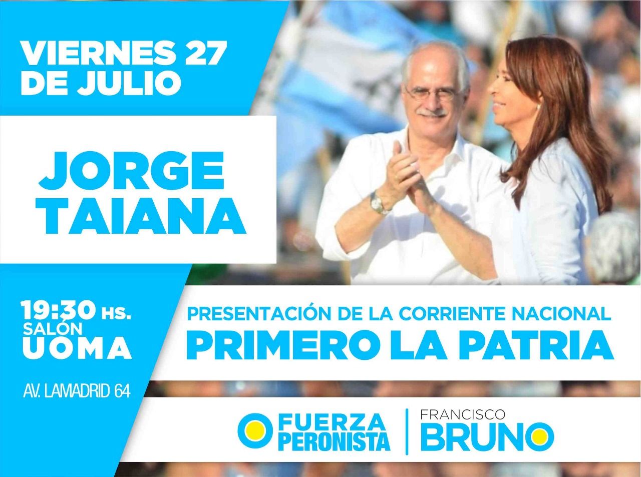 El viernes 27 de Julio, Jorge Taiana arribará a nuestra ciudad. Con una agenda cargada durante el día, en la que dialogará con distintos sectores de nuestra comunidad, la visita culminará con un acto en el salón de UOMA a partir de las 19:30 hs. Según informó el dirigente Francisco “Pancho” Bruno, la actividad será en el marco del lanzamiento de la Corriente Nacional Primero la Patria, y se invita a asistir a todos los vecinos y vecinas de Chacabuco que tienen “la esperanza de volver a construir un gobierno Nacional y Popular”.