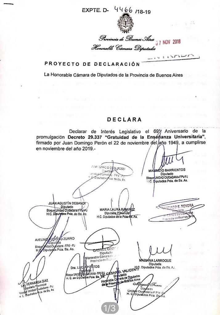 El diputado Mauricio Barrientos presentó un Proyecto declarando de interés legislativo la fecha en la que se conmemora el decreto firmado por Juan Domingo Perón el 22 de noviembre de 1949; el cual sancionaba la suspensión del cobro de los aranceles universitarios.