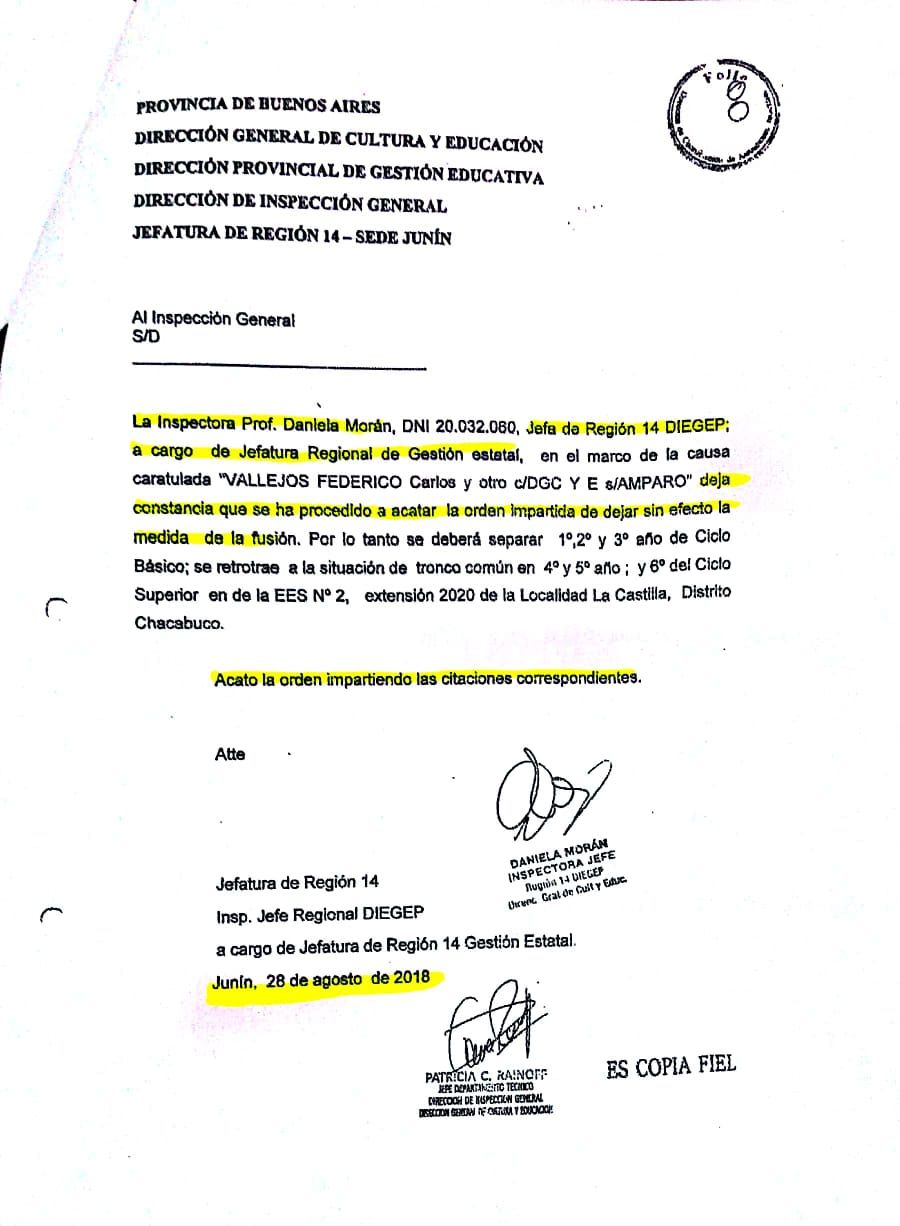 “En el medio de eso, nosotros le notificamos al juez que no estaban cumpliendo la medida y fue la Provincia la que respondió diciendo que se había acatado la medida y que se estaba cumpliendo. La realidad es que contactándonos con la escuela y los padres de los alumnos hasta el día de la fecha nos dicen que todo continúa tal como está desde el día de la fusión”.