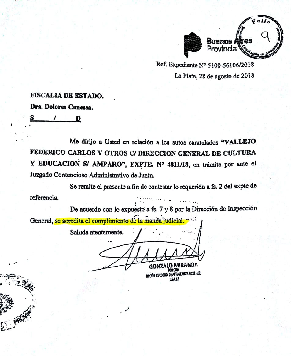 Segura recordó que “el 13 de agosto de este año el Juez Basani de Junín dicta una medida cautelar que ordena el desdoblamiento de los cursos que la Provincia de Buenos Aires había fusionado. Hasta el día de la fecha esa medida no se ha cumplido”.