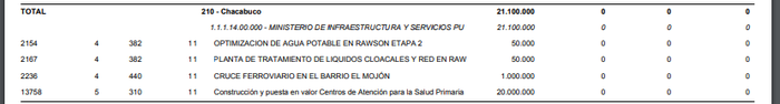 - La Planta de Tratamiento de Líquidos Cloacales en Rawson por un monto de 50 mil pesos.