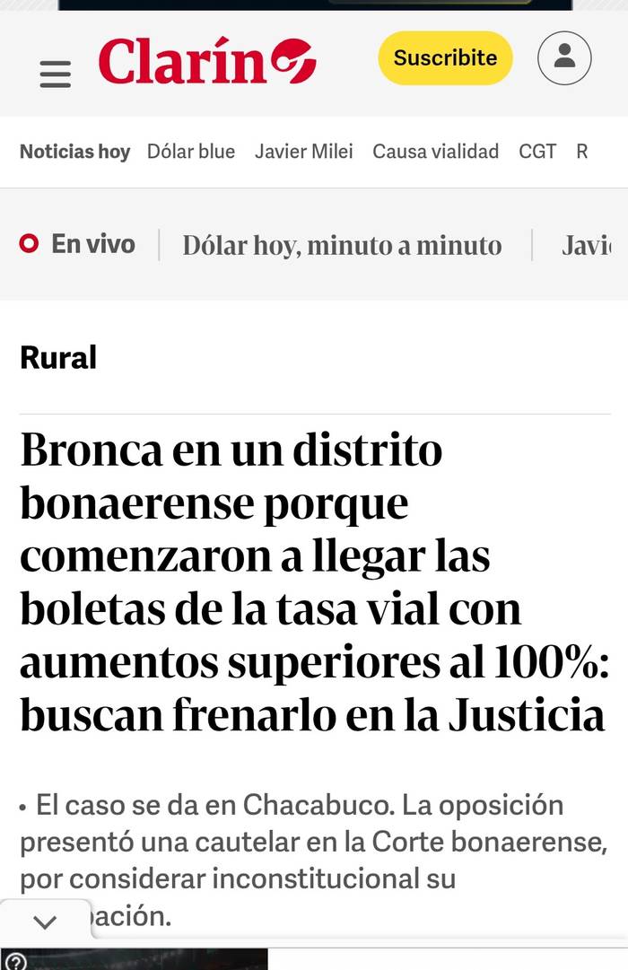 “Bronca en un distrito bonaerense porque comenzaron a llegar las boletas de la tasa vial con aumentos superiores al 100%: buscan frenarlo en la Justicia”. Así se titula el artículo, en el que se señala que productores rurales y concejales de la oposición buscan “a través de diferentes herramientas” que se dé marcha atrás con el aumento de la Tasa Vial “y la creación de un nuevo tributo impulsado por el oficialismo”.