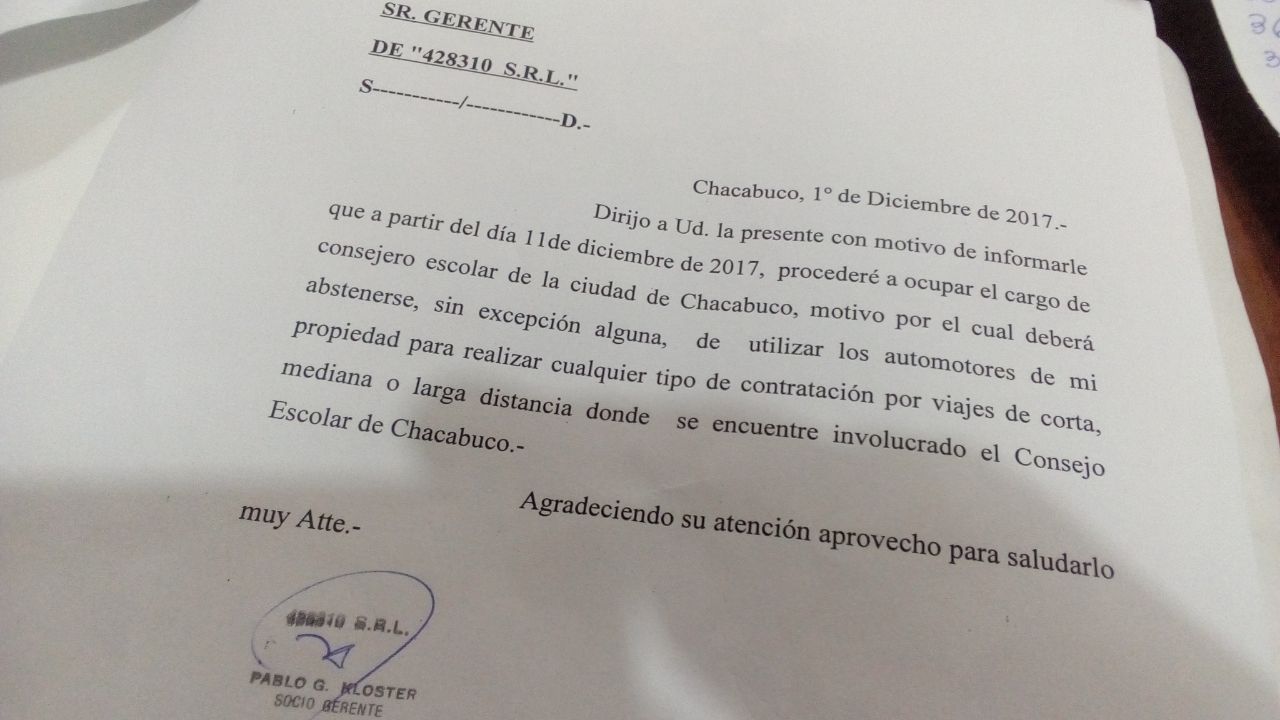 Lo llamativo es que la nota, que está dirigida a Pablo Kloster, el gerente esta firmada por el propio Kloster y no aparece la firma de Di Pinto.