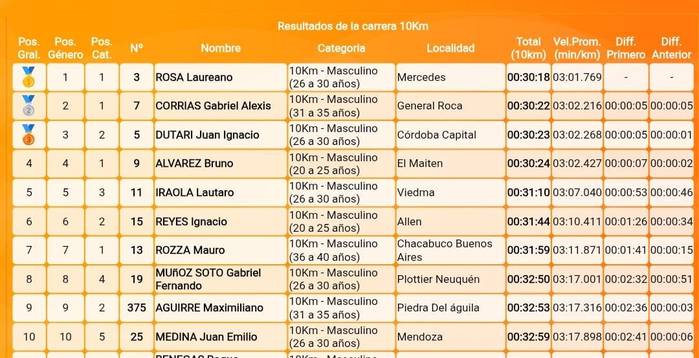 El ganador de la competencia fue en mercedino Laureano Rosa, con un tiempo de 30 minutos 18 segundos. Segundo se ubicó Gabriel Corrias (General Roca), con 30 minutos 22 segundos, y tercero resultó Juan Ignacio Dutari (Córdoba), con 30 minutos 23 segundos, mientras que Mauro Rozza conometró 31 minutos 59 segundos para conclui en el séptimo puesto en la general y primero en la categoría de 36 a 40 años.