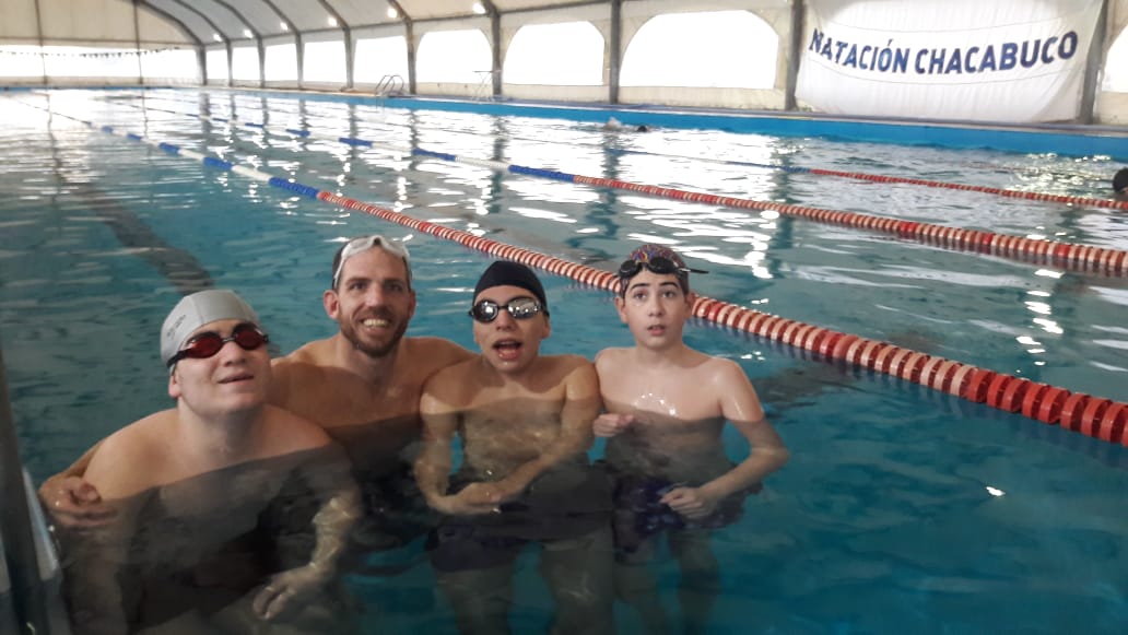 Desde hace 5 meses, todos los martes y jueves Mauricio y Joaquin practican Natación junto a otros chicos en el Anexo del Club Social bajo la conducción de Gonzalo Correas, en el programa de inclusión que lleva adelante la institución.