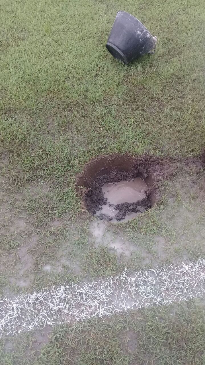 Las altas precipitaciones se hicieron presentes nuevamente en la mañana de hoy, sin embargo, el campo de juego de 9 de Julio se encuentra en buenas condiciones y se están haciendo trabajos para quitar el agua que un se almacena en el terreno.