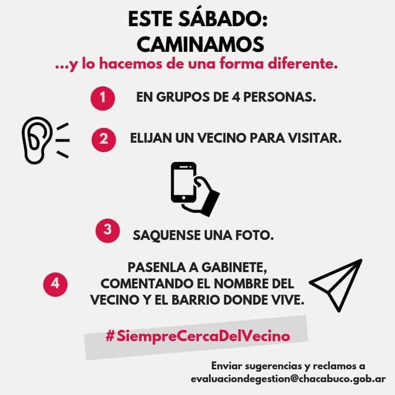 Sobre el final de la gacetilla de prensa se informa lo siguiente: “Hace 37 años que tengo el taller y es la primera ves que un intendente de mi pueblo viene acá“; “Siempre está, nunca nos dejó“; “De los años que estoy acá es la primera ves que viene alguien a visitarnos y a tratar de solucionar algún problemita que siempre está”; “Muy agradecido por lo que está haciendo por Chacabuco”,fueron algunos de los testimonios recogidos después de las visitas a los domicilios de los vecinos. Una gacetilla municipal que parece uno de los tantos spots que se pueden ver en el Canal Municipal de lunes a viernes. Este es el instructivo que se envió a los funcionarios: