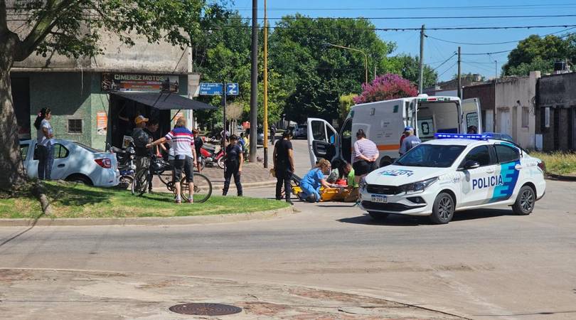 Esta mañana se registró un nuevo accidente de tránsito en la intersección de avenida Perón y calle Alem, donde colisionaron una motocicleta y un automóvil Renault.
