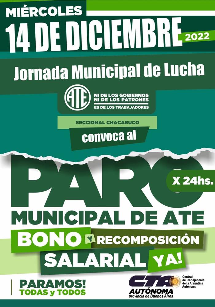 Esta mañana, tras discutirlo con sus bases, ATE Chacabuco convocó a un paro por 24 horas el día miércoles 14 de diciembre, por un “bono de fin de año y por recomposición salarial”.