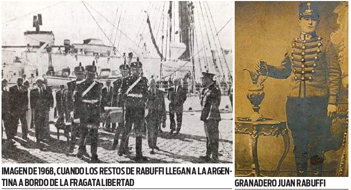 Pasarían 59 años antes de que su sueño de volver a la patria se hiciera realidad. En 1968, gracias a las gestiones de sus antiguos camaradas —ya octogenarios—, los restos de Juan Rabuffi fueron repatriados a bordo de la fragata Libertad. El 31 de enero de ese año, a las 9 de la mañana, la urna con sus restos arribó al Puerto Nuevo de Buenos Aires. Tras las honras correspondientes, fue trasladada a Castilla, el pueblo que adoptó como propio.