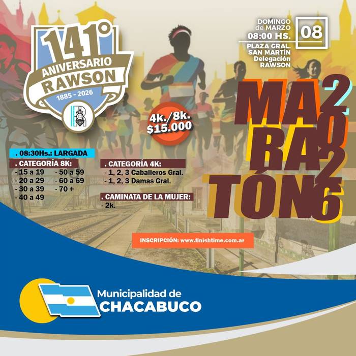 La celebración comenzará desde temprano con la tradicional Maratón Aniversario Rawson, una propuesta deportiva que ya es un clásico en la región y que convoca a corredores y familias de distintas localidades.