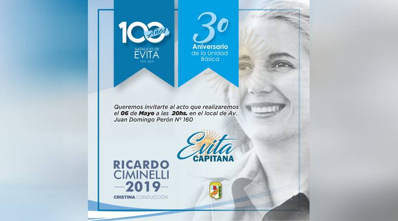 El acto se realizará este lunes 6 de Mayo a las 20 hs en Avenida Perón n° 180.