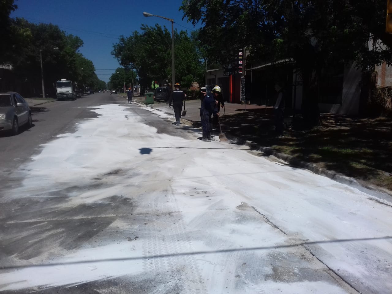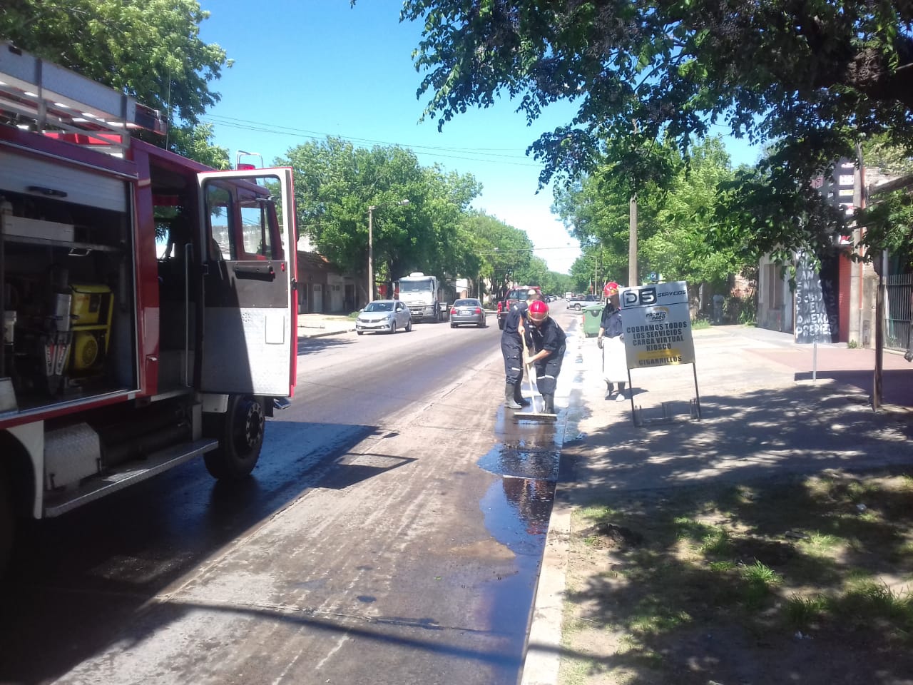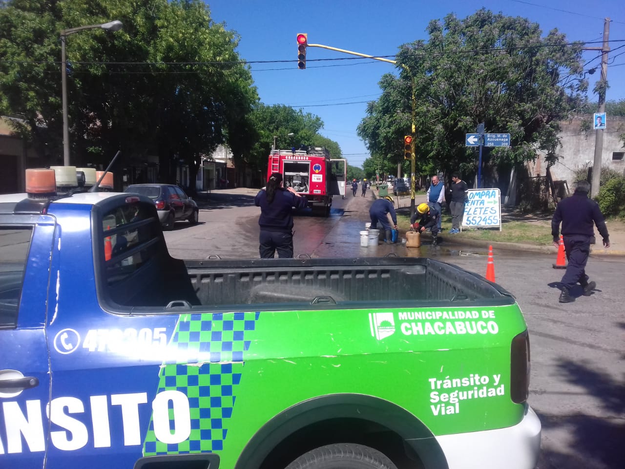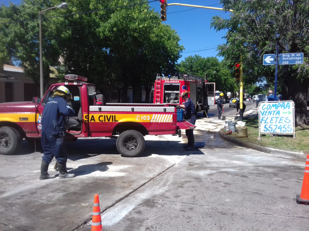 Hace minutos personal de Bomberos y Defensa Civil finalizaron con la limpieza de la avenida Garay en su intersección con Azcuénaga, donde se habían derramado varios litros de gasoil.