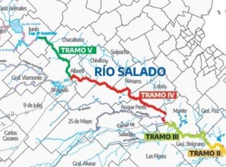 El Plan Maestro Integral del Río Salado tiene una extensión total de 531 kilómetros, de los cuales 402 ya fueron finalizados, mientras que 33 km del Tramo 4.2 -entre Ernestina, en el partido de 25 de Mayo, y la ruta nacional 205-, cuya ejecución le corresponde al gobierno nacional, estuvieron paralizados hasta hace unos meses y recientemente se retomó en una extensión de 10 km.