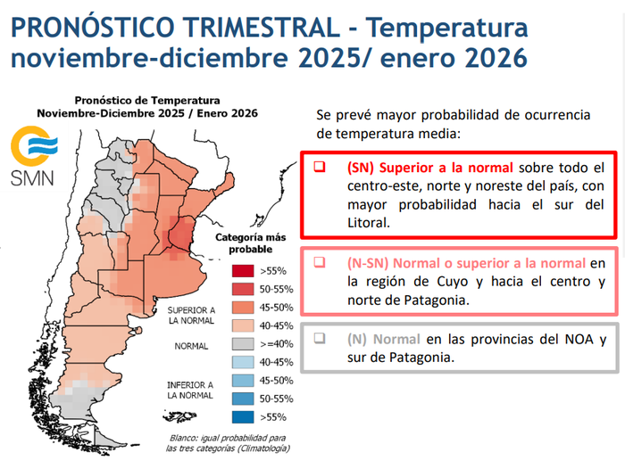 De acuerdo con el informe difundido por el Servicio Meteorológico Nacional (SMN), la categoría con mayor probabilidad de ocurrencia para este trimestre es la de “Superior a lo normal” (SN), lo que implica una tendencia a temperaturas más elevadas que los valores promedio históricos.