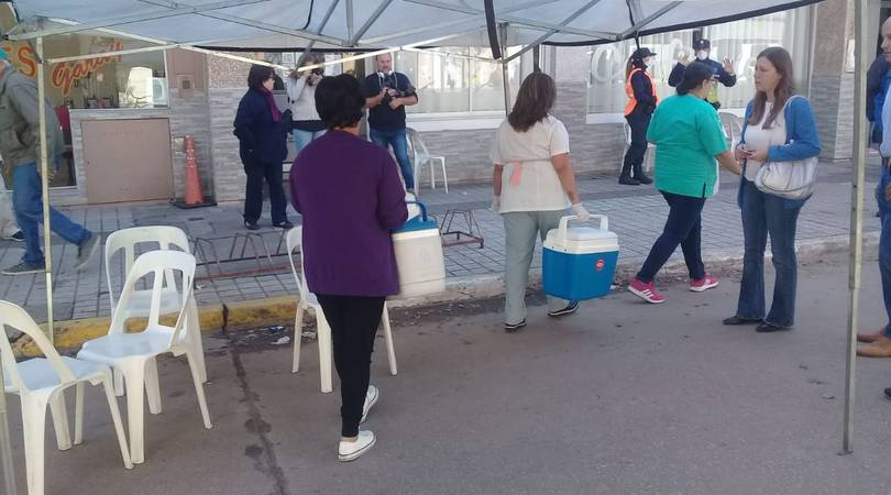 Hoy, en la cola de los bancos, personal del vacunatorio, está vacunando a los mayores de 65 años para que no tengan que regresar al Hospital.