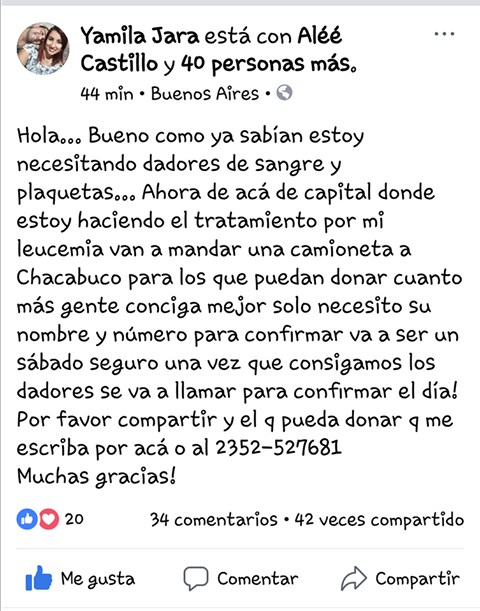 Yamila Jara está internada en Capital Federal por un tratamiento contra la Leucemia y necesita donantes de sangre y plaquetas. Los interesados pueden comunicarse al numero: 2352-527681