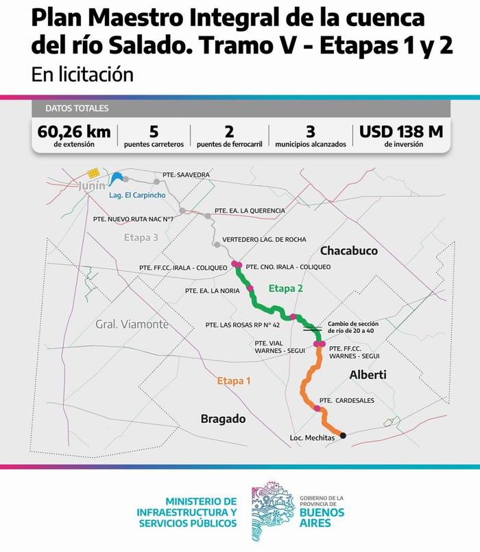 Los trabajos en las etapas 1 y 2 del Tramo V se extenderán desde el Canal del Este, a la salida de la laguna de Bragado, entre ese partido y Alberti, hasta el puente de Irala, sobre una longitud total de 60,26 km.