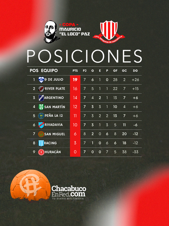 Este miércoles por la noche culminó una nueva fecha de la fase regular del Torneo Local de Primera División que organiza la Liga Deportiva de Chacabuco. En la cancha de River Plate fue victoria del local por 7 a 1 ante San Miguel.