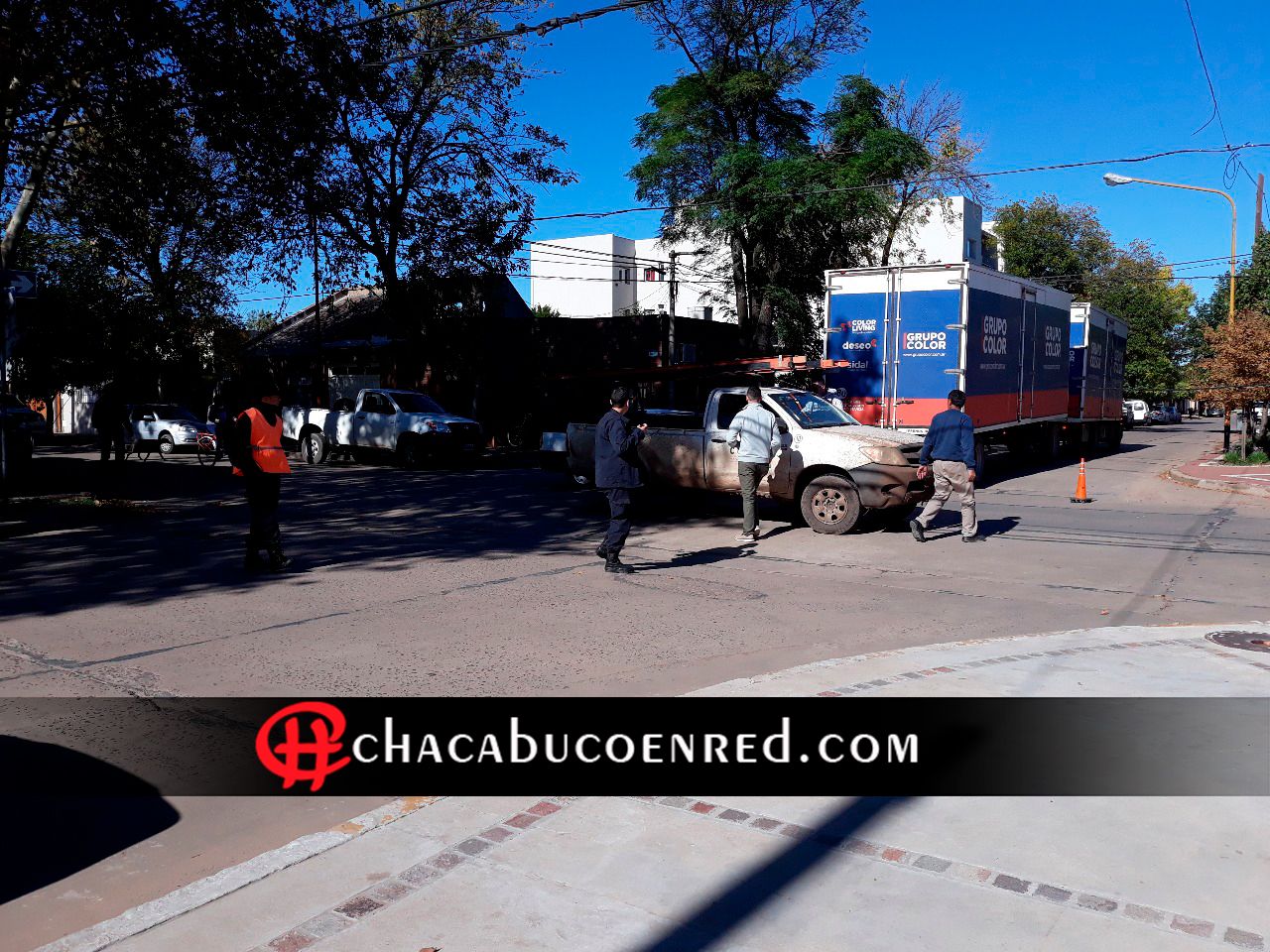 Hace minutos en la intersección de las calles La Rioja y 9 de Julio un camión cortó cables y volteó un poste.