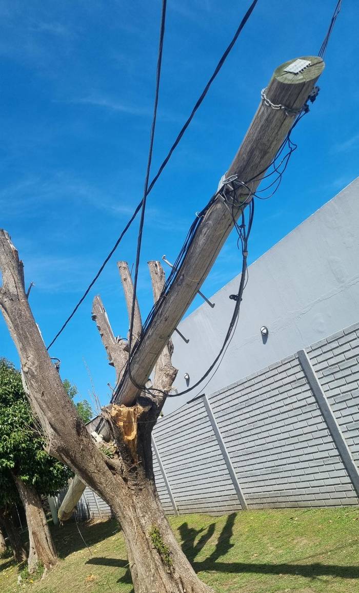 El poste, que presentaba un notable deterioro, terminó inclinado y quedó sostenido únicamente por una planta ubicada sobre la vereda. Vecinos del lugar alertaron sobre el peligro que representa la situación, especialmente para los peatones y vehículos que circulan por la zona.
