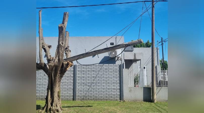 El poste, que presentaba un notable deterioro, terminó inclinado y quedó sostenido únicamente por una planta ubicada sobre la vereda. Vecinos del lugar alertaron sobre el peligro que representa la situación, especialmente para los peatones y vehículos que circulan por la zona.